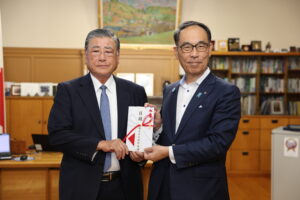 令和7年7月31日に㈱境野養鶏第58期の決算を迎えるにあたり、農場が所在する市町村に対して、地元の繁栄と子供達の未来のために寄附を行いました。具体的には埼玉県、群馬県、本庄市、深谷市、上里町、美里町、高山村に対し総額1,000万円を寄贈しました。各広報誌はもとより新聞にも大きく取り上げられるなど、当社の社会貢献活動が広く世に知られることとなりました。(写真は令和7年9月24日、埼玉県庁知事室にて大野知事と記念撮影する境野社長)